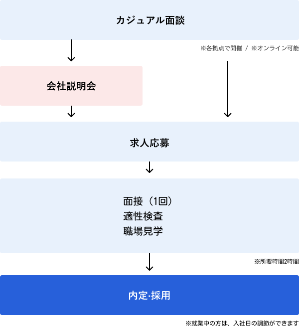 新たなキャリアを安心して始められるように 応募前に会社説明会にご参加いただいたり、先輩社員とのカジュアル面談を行うことも可能です。まずはお気軽にお問い合わせいただき、会社のことを知ってから応募をお考え下さい!